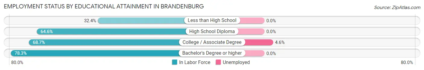 The median household income in Brandenburg is $37,000, and the median home value is $125,000. The town has a poverty rate of 17.3%, and the unemployment rate is 5.2%.