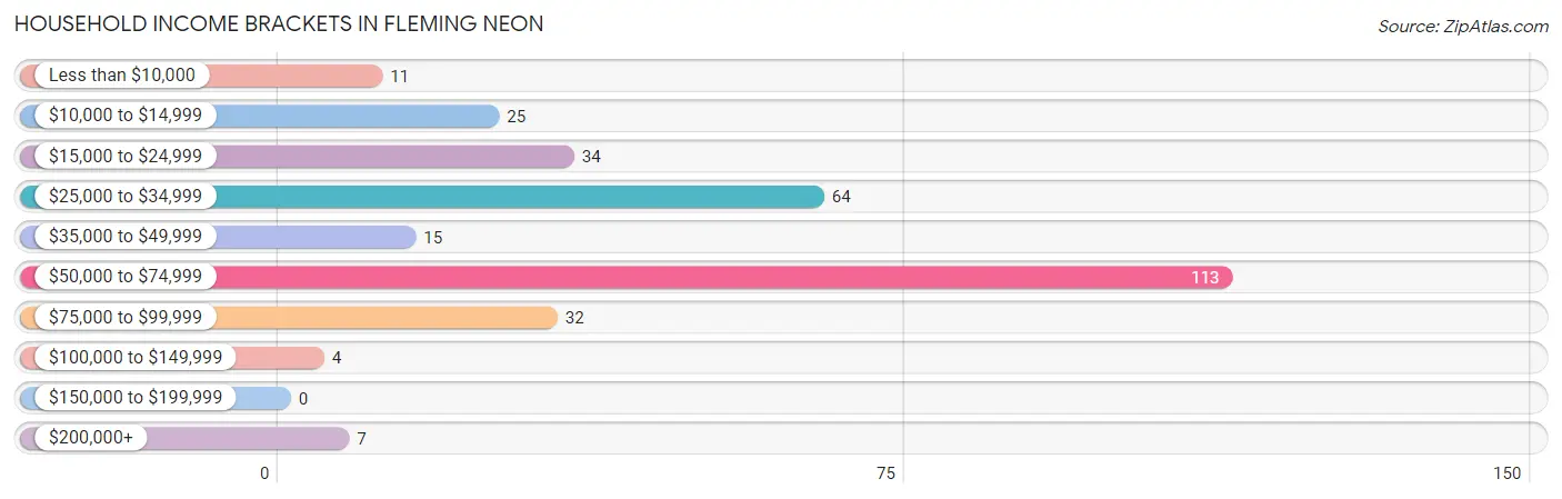 According to the Fleming Neon family income data, there are 103 families falling into the $50,000 to $74,999 income range, which is the most common income bracket and makes up 40.1% of all families.