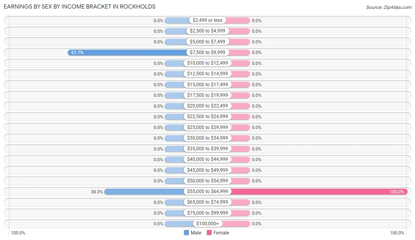 The most common earnings brackets in Rockholds are $7,500 to $9,999 for men (66 | 61.7%) and $55,000 to $64,999 for women (55 | 100.0%).
