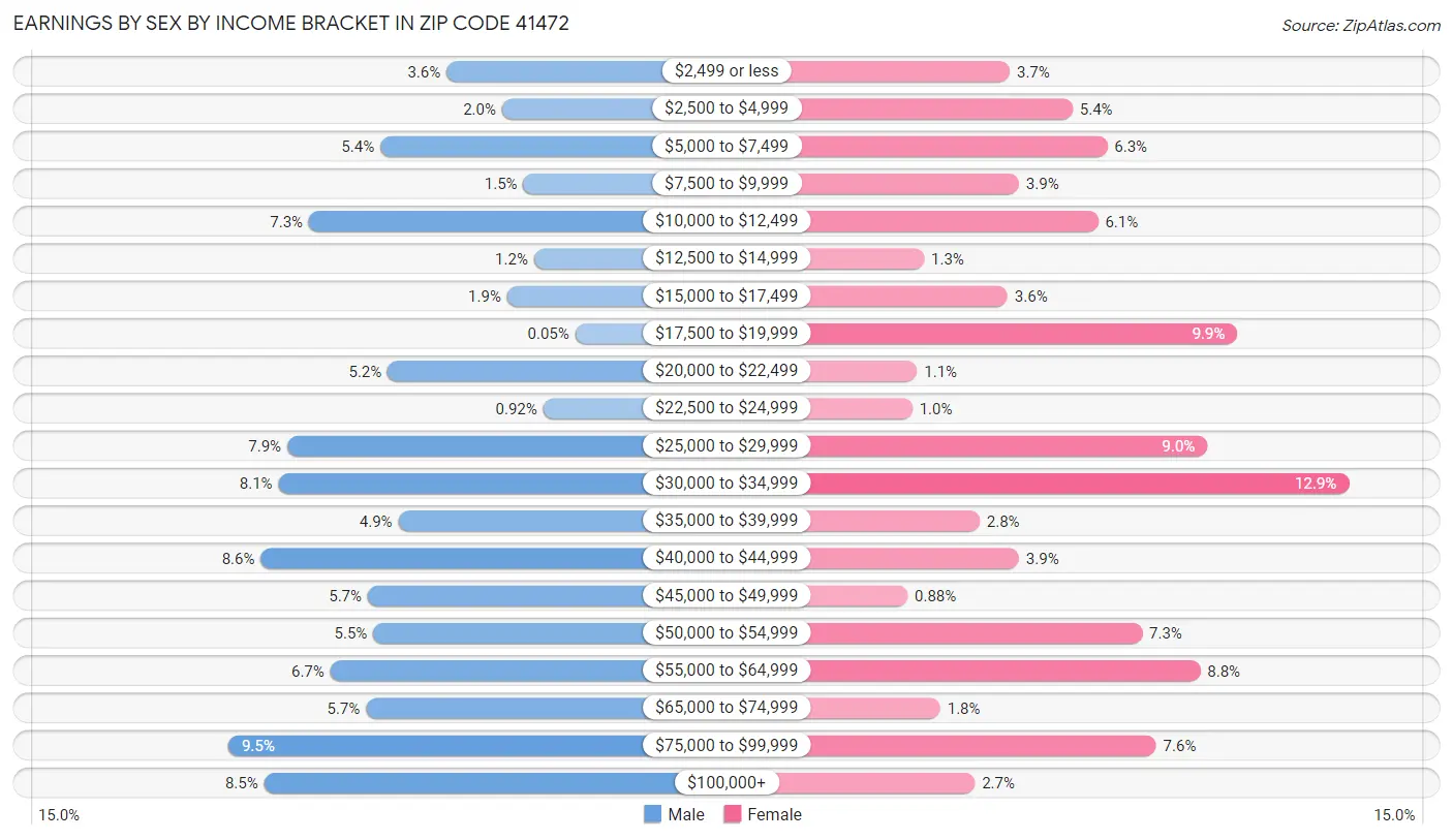 The most common earnings brackets in Zip Code 41472 are $75,000 to $99,999 for men (195 | 9.5%) and $30,000 to $34,999 for women (204 | 12.9%).