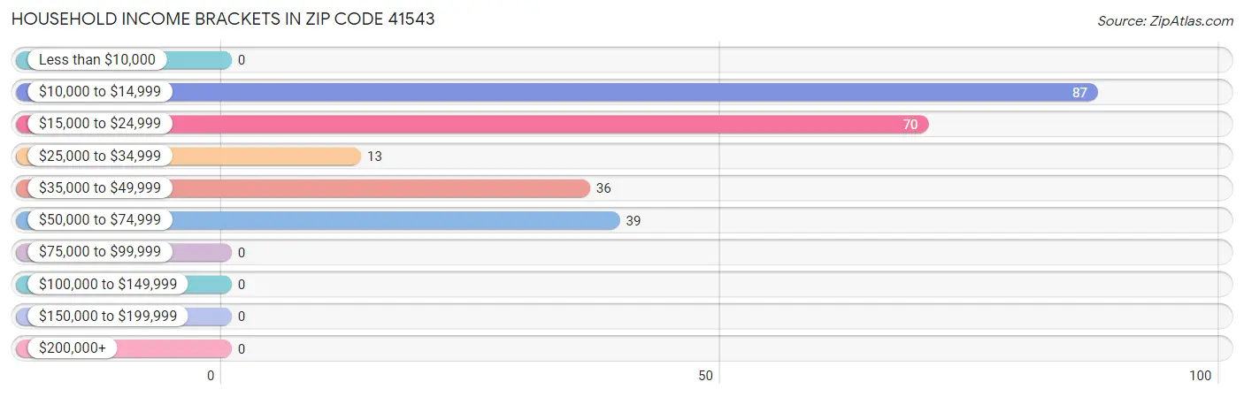 Per Capita Income in Zip Code 41543 is $14,002, while median incomes of families and households are $45,174 and $20,057 respectively.