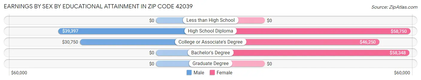 Average earnings in Zip Code 42039 are $43,375 for men and $58,500 for women, a difference of 25.9%. Men with an educational attainment of high school diploma enjoy the highest average annual earnings of $39,397, while those with college or associate's degree education earn the least with $30,750. Women with an educational attainment of high school diploma earn the most with the average annual earnings of $58,750, while those with college or associate's degree education have the smallest earnings of $46,250.