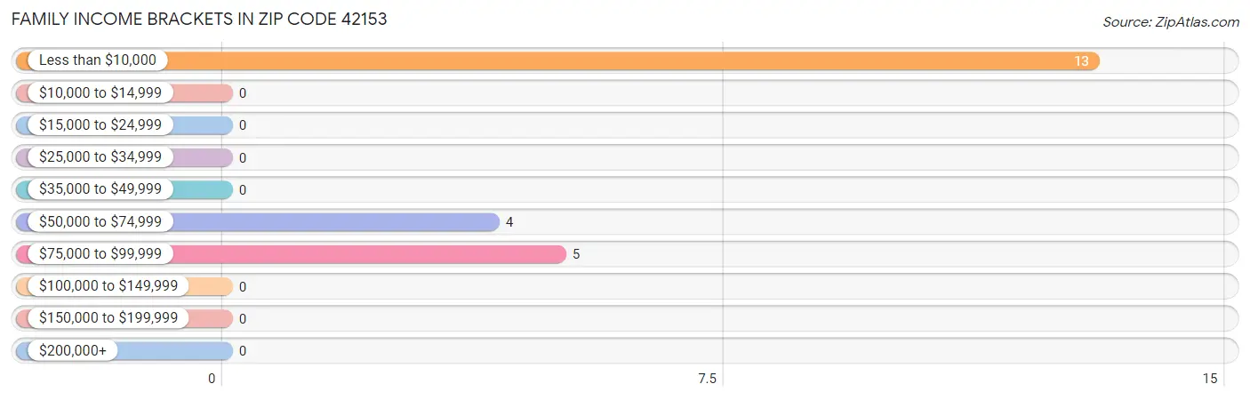 According to the Zip Code 42153 family income data, there are 13 families falling into the less than $10,000 income range, which is the most common income bracket and makes up 59.1% of all families.