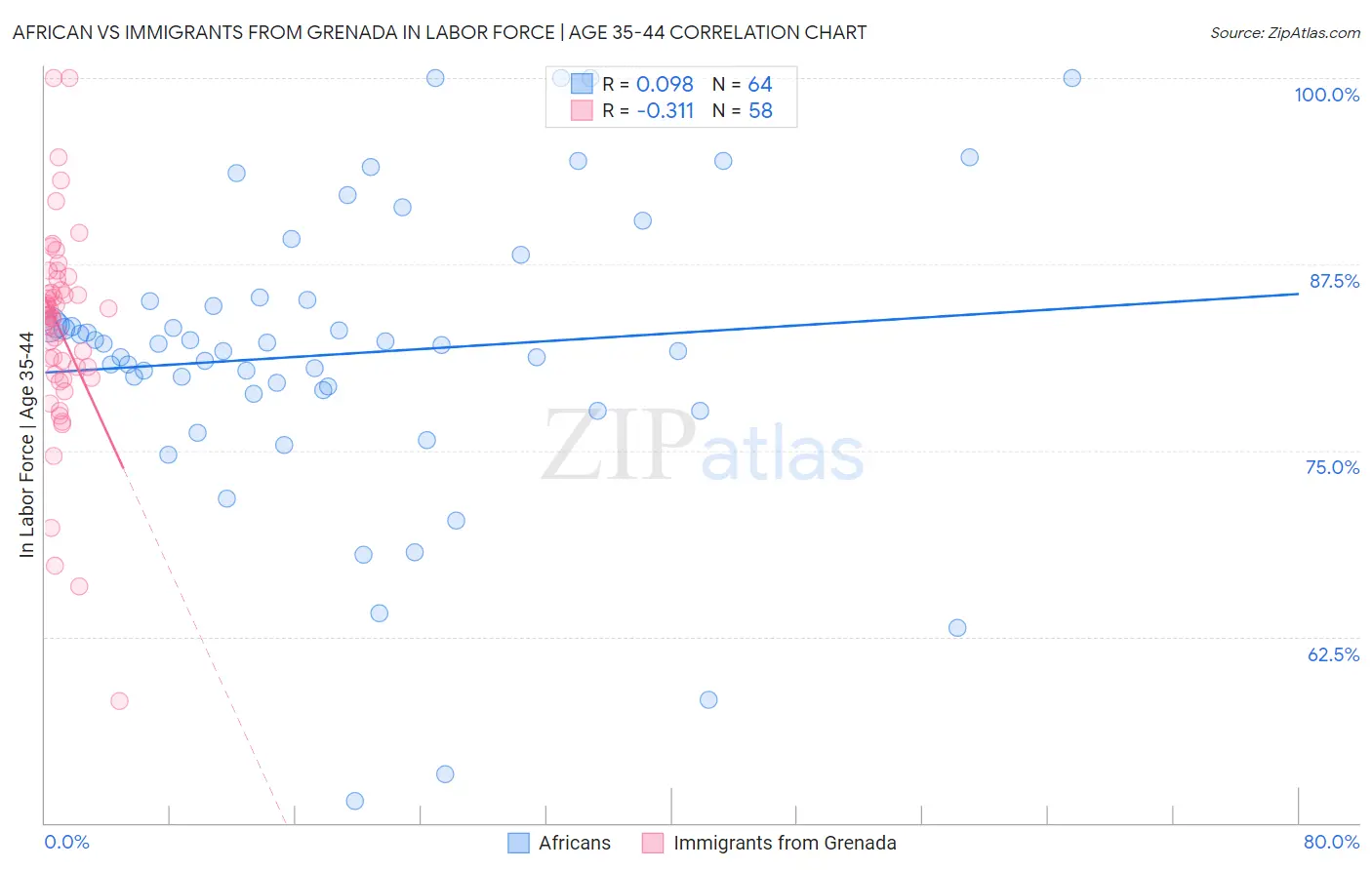 African vs Immigrants from Grenada In Labor Force | Age 35-44 Correlation Chart