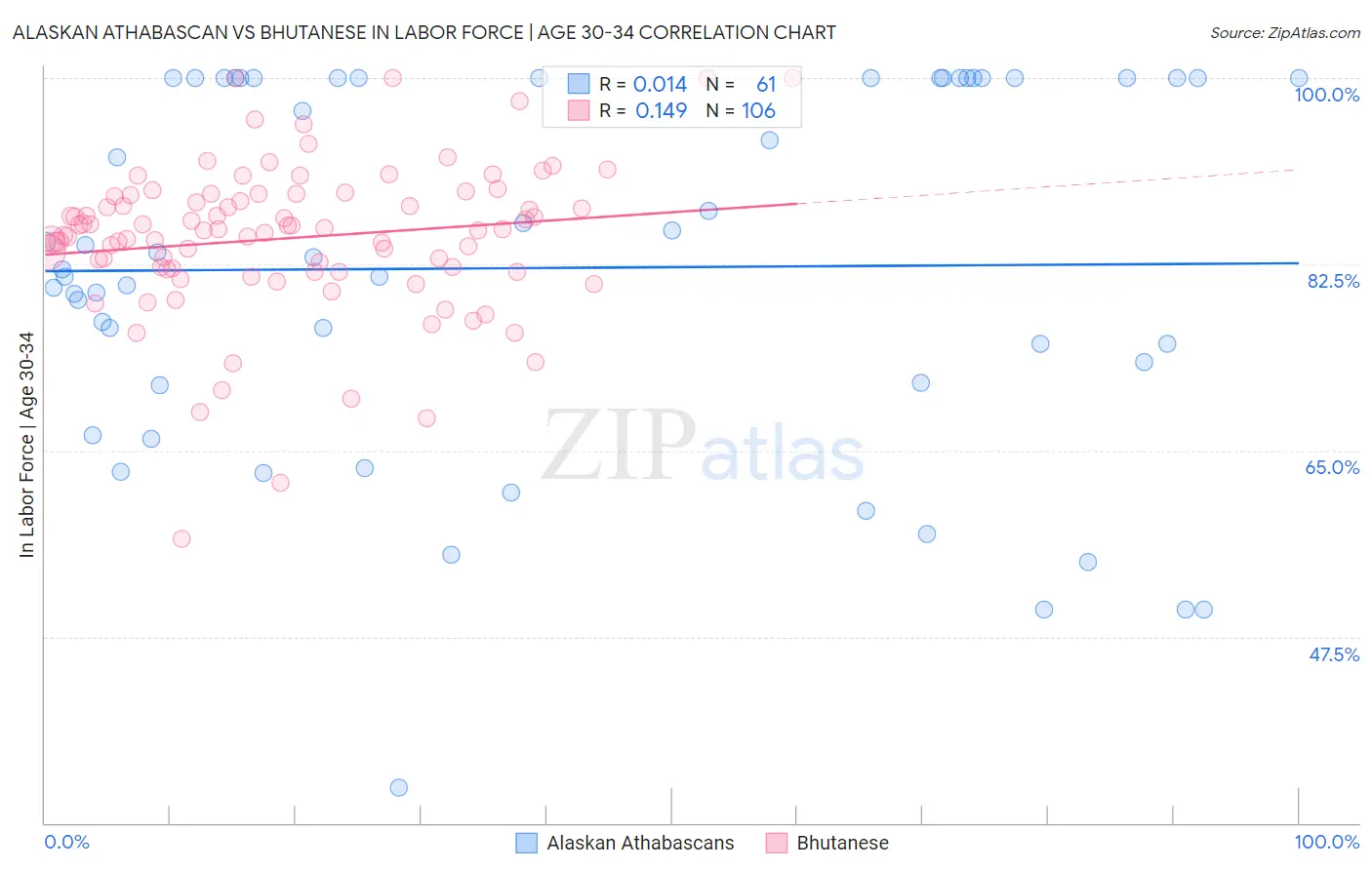 Alaskan Athabascan vs Bhutanese In Labor Force | Age 30-34 Correlation Chart