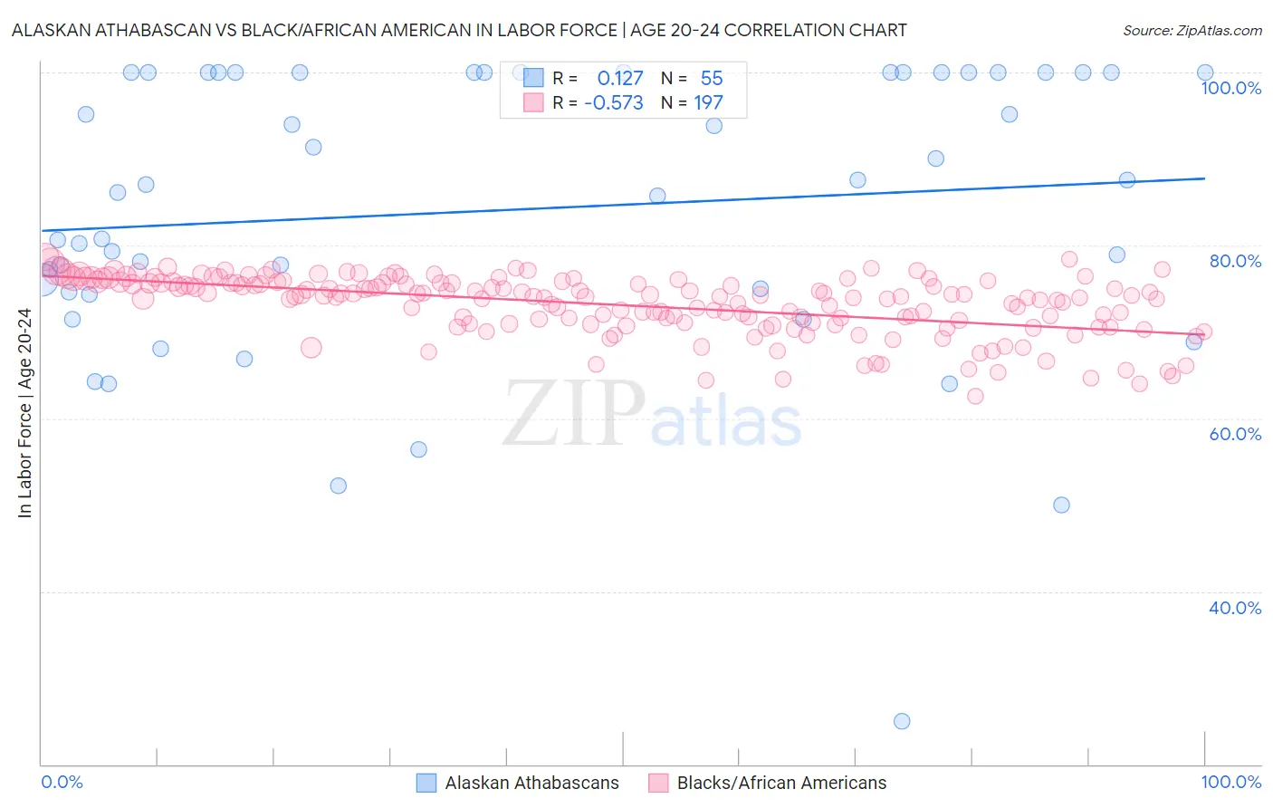 Alaskan Athabascan vs Black/African American In Labor Force | Age 20-24 Correlation Chart