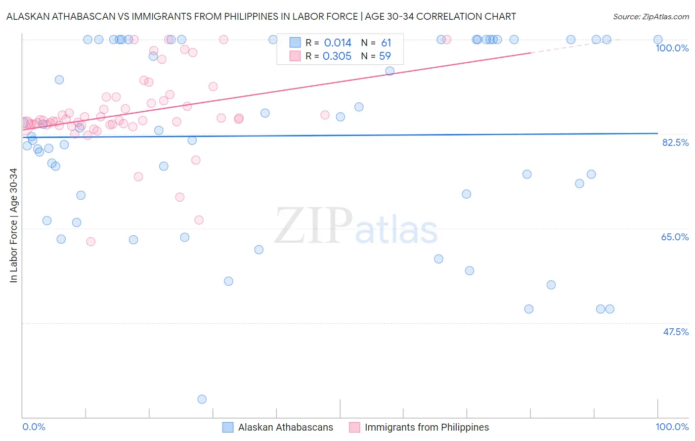 Alaskan Athabascan vs Immigrants from Philippines In Labor Force | Age 30-34 Correlation Chart