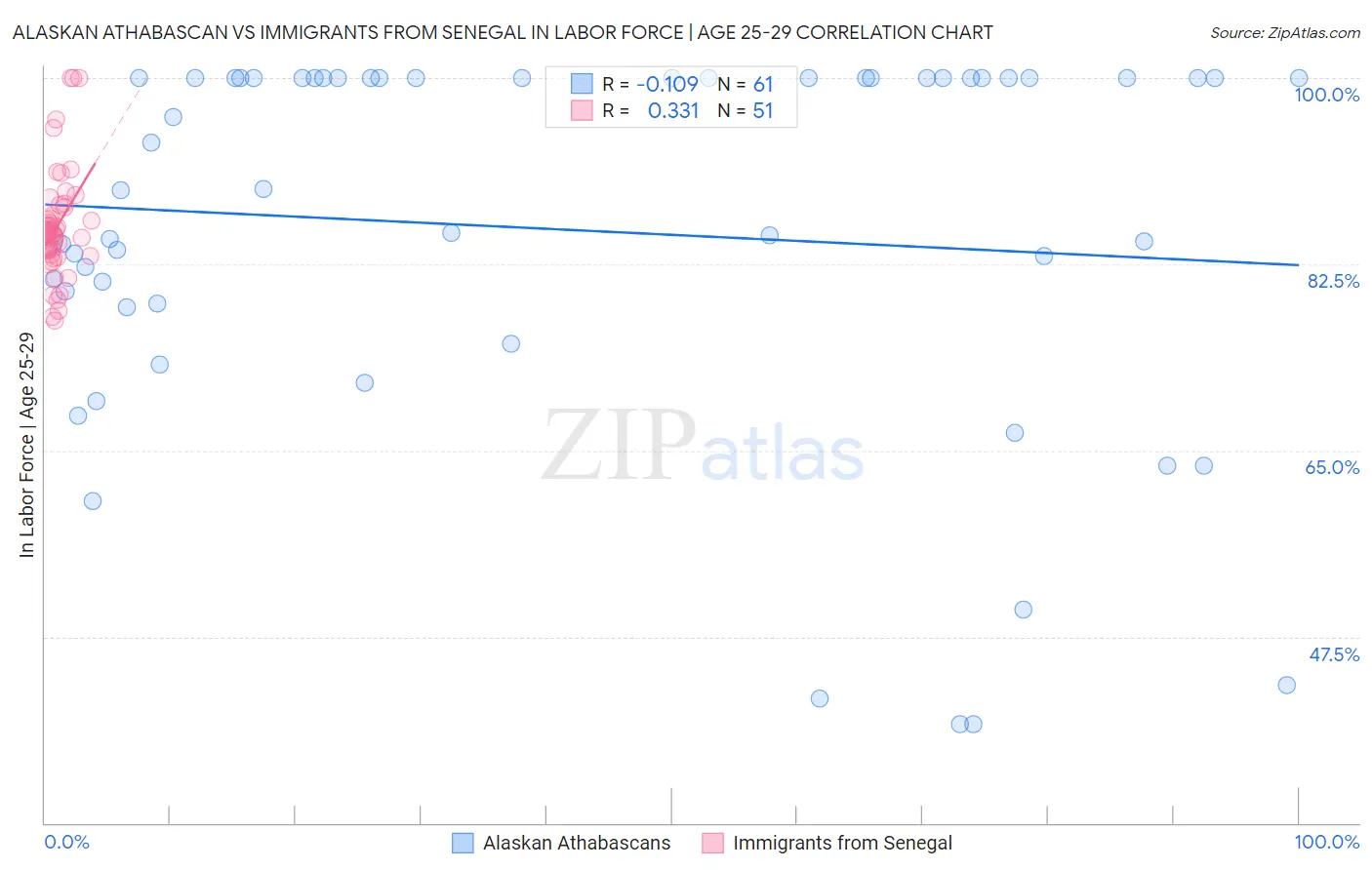 Alaskan Athabascan vs Immigrants from Senegal In Labor Force | Age 25-29 Correlation Chart