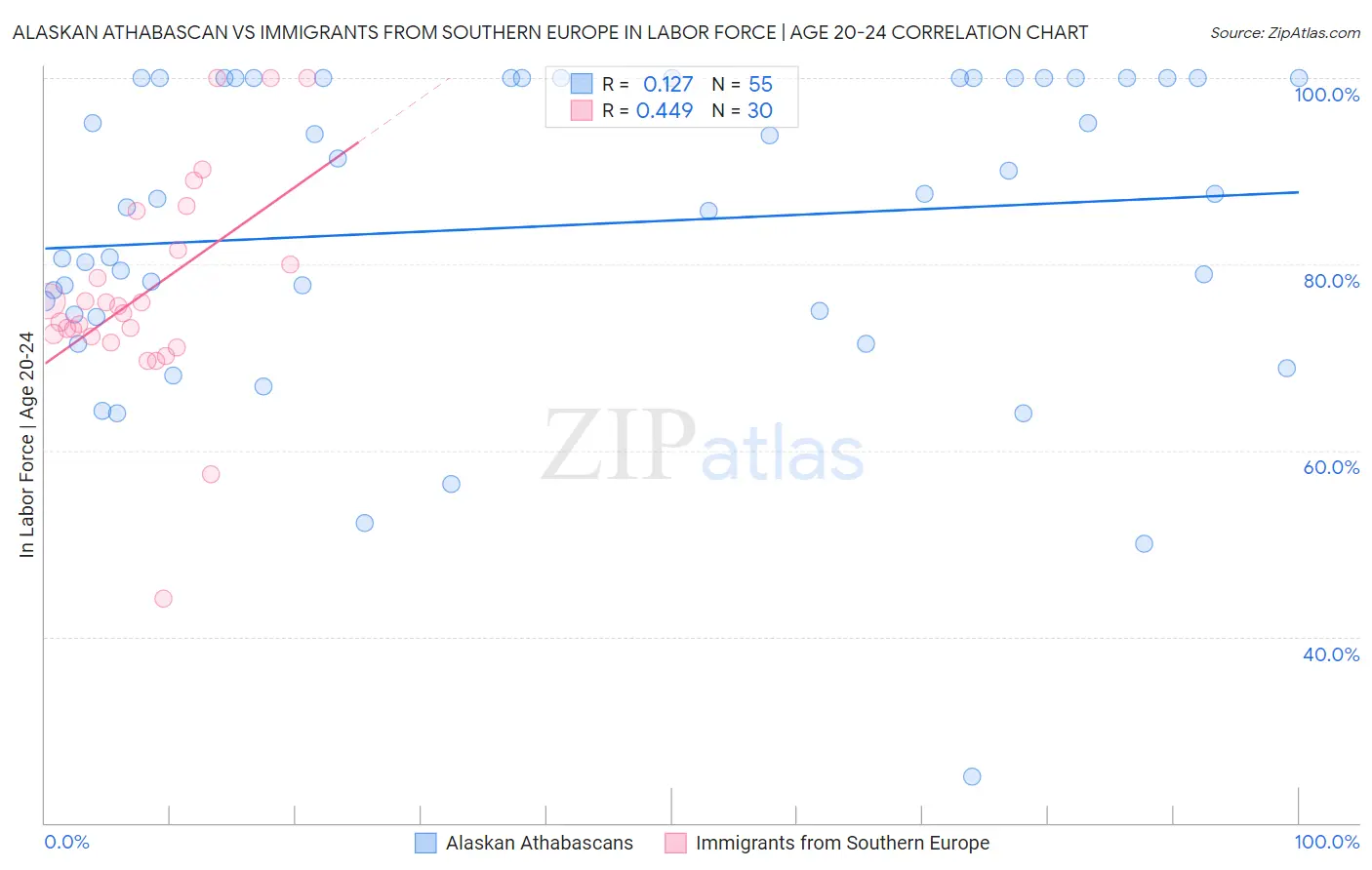 Alaskan Athabascan vs Immigrants from Southern Europe In Labor Force | Age 20-24 Correlation Chart