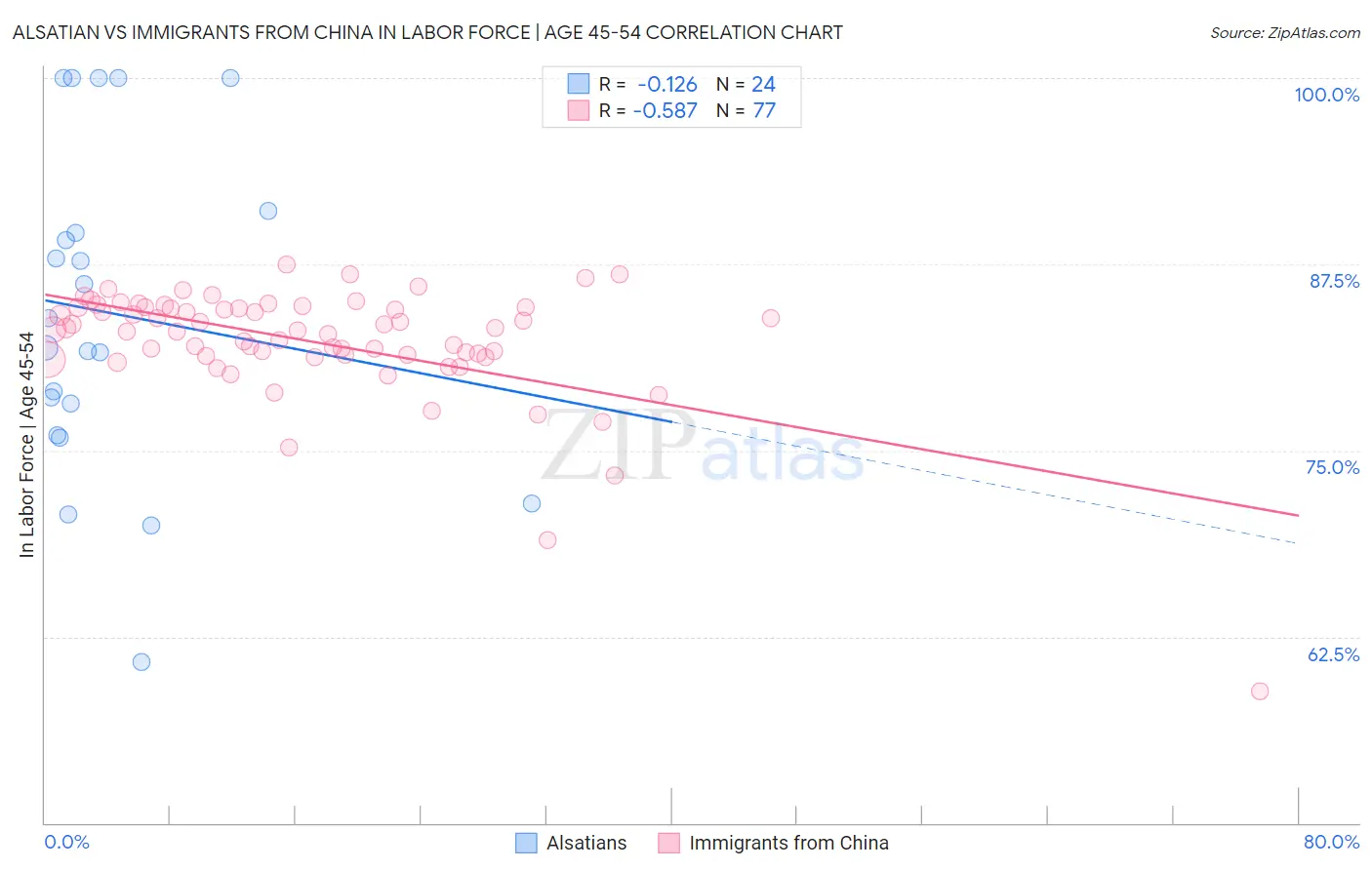 Alsatian vs Immigrants from China In Labor Force | Age 45-54 Correlation Chart