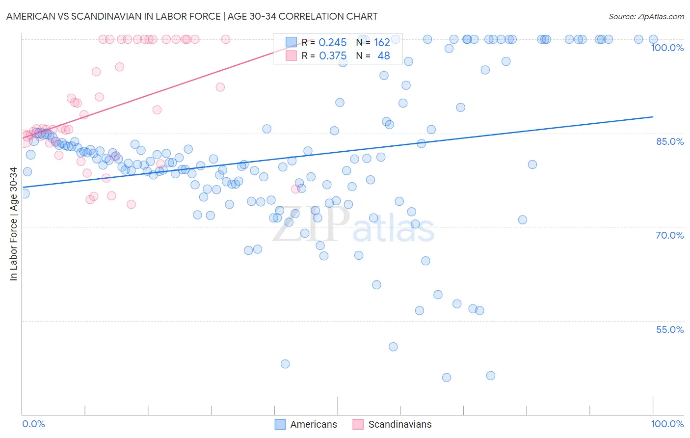 American vs Scandinavian In Labor Force | Age 30-34 Correlation Chart