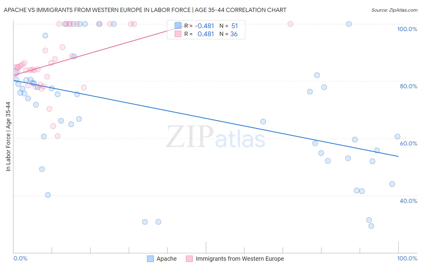 Apache vs Immigrants from Western Europe In Labor Force | Age 35-44 Correlation Chart