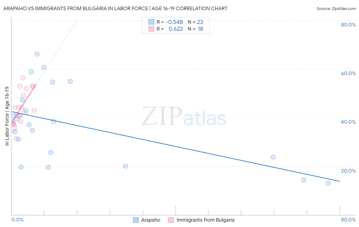 Arapaho vs Immigrants from Bulgaria In Labor Force | Age 16-19 Correlation Chart