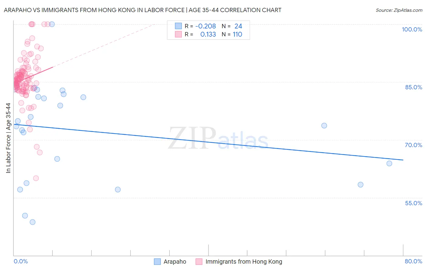 Arapaho vs Immigrants from Hong Kong In Labor Force | Age 35-44 Correlation Chart