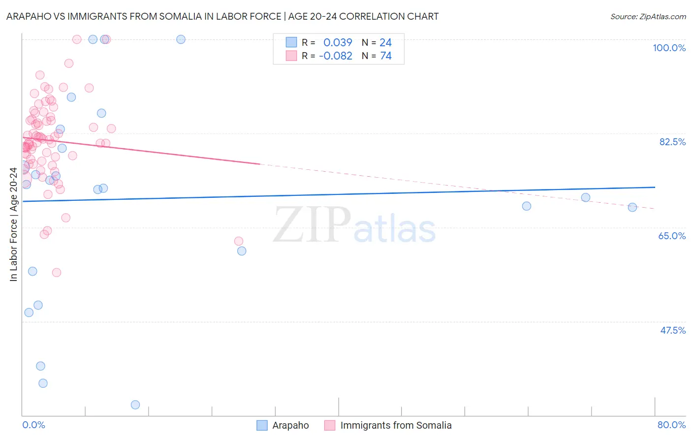 Arapaho vs Immigrants from Somalia In Labor Force | Age 20-24 Correlation Chart