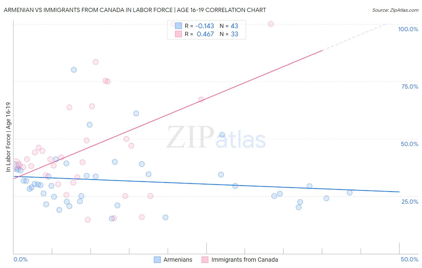 Armenian vs Immigrants from Canada In Labor Force | Age 16-19 Correlation Chart