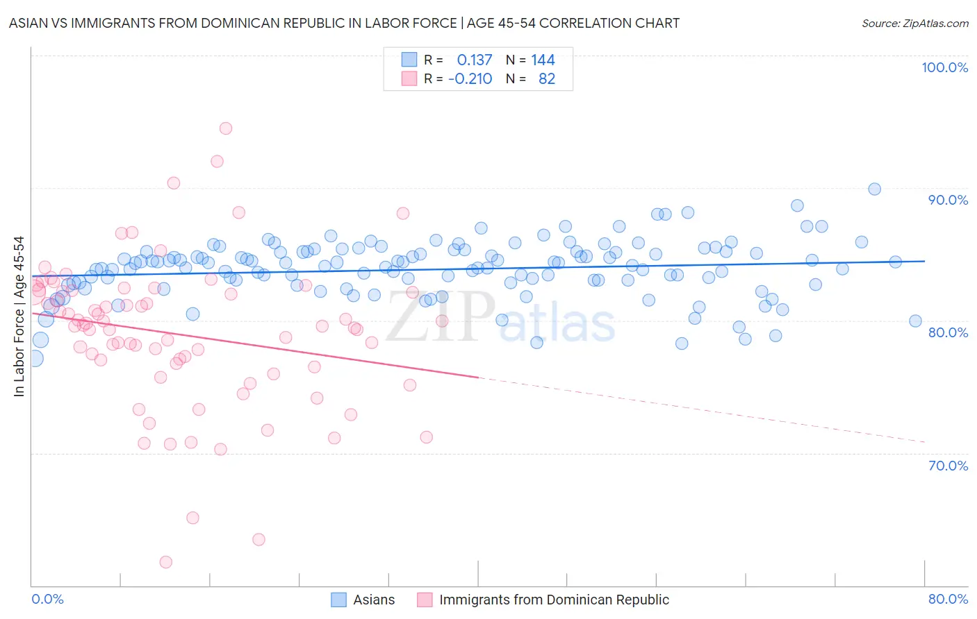 Asian vs Immigrants from Dominican Republic In Labor Force | Age 45-54 Correlation Chart