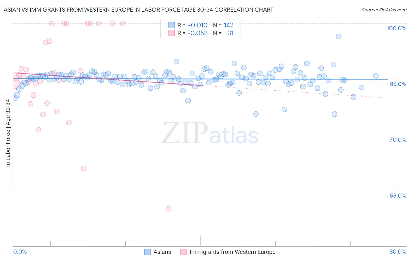 Asian vs Immigrants from Western Europe In Labor Force | Age 30-34 Correlation Chart