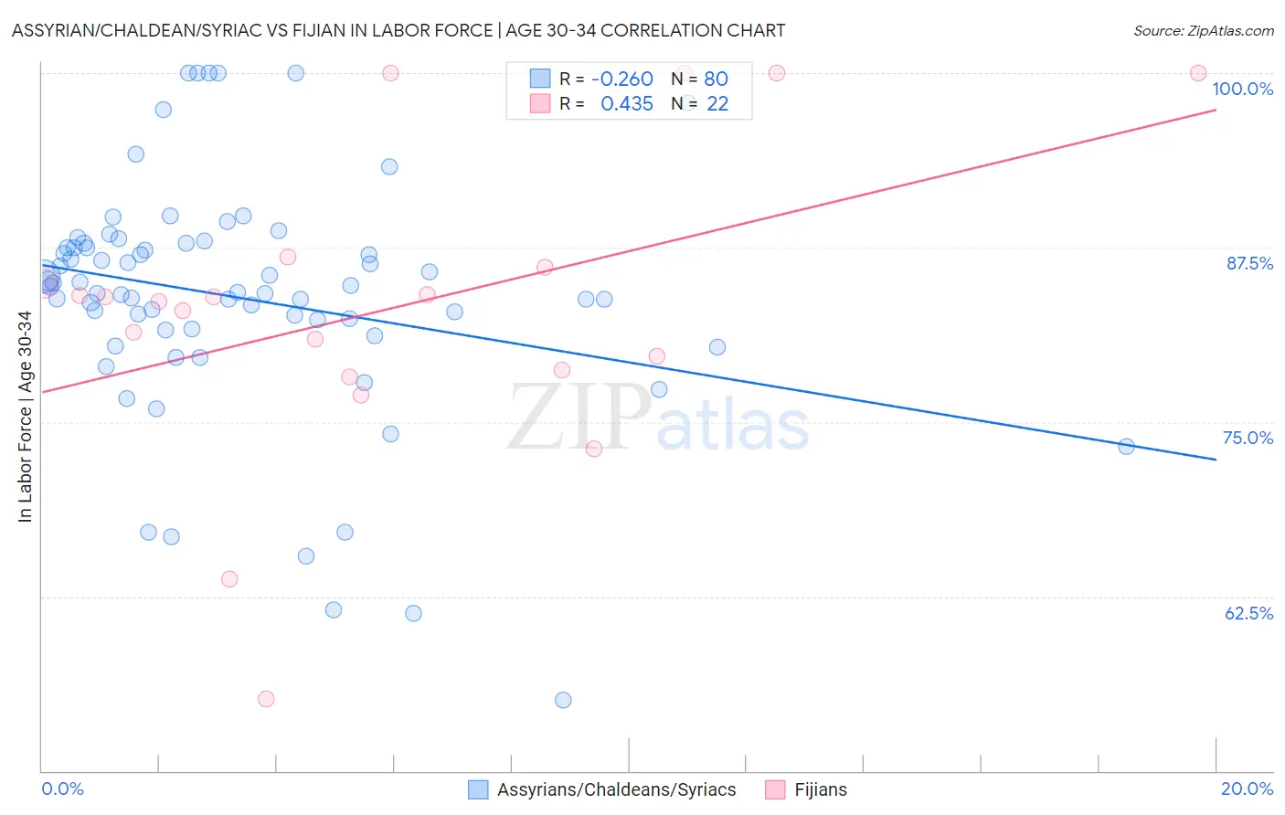 Assyrian/Chaldean/Syriac vs Fijian In Labor Force | Age 30-34 Correlation Chart