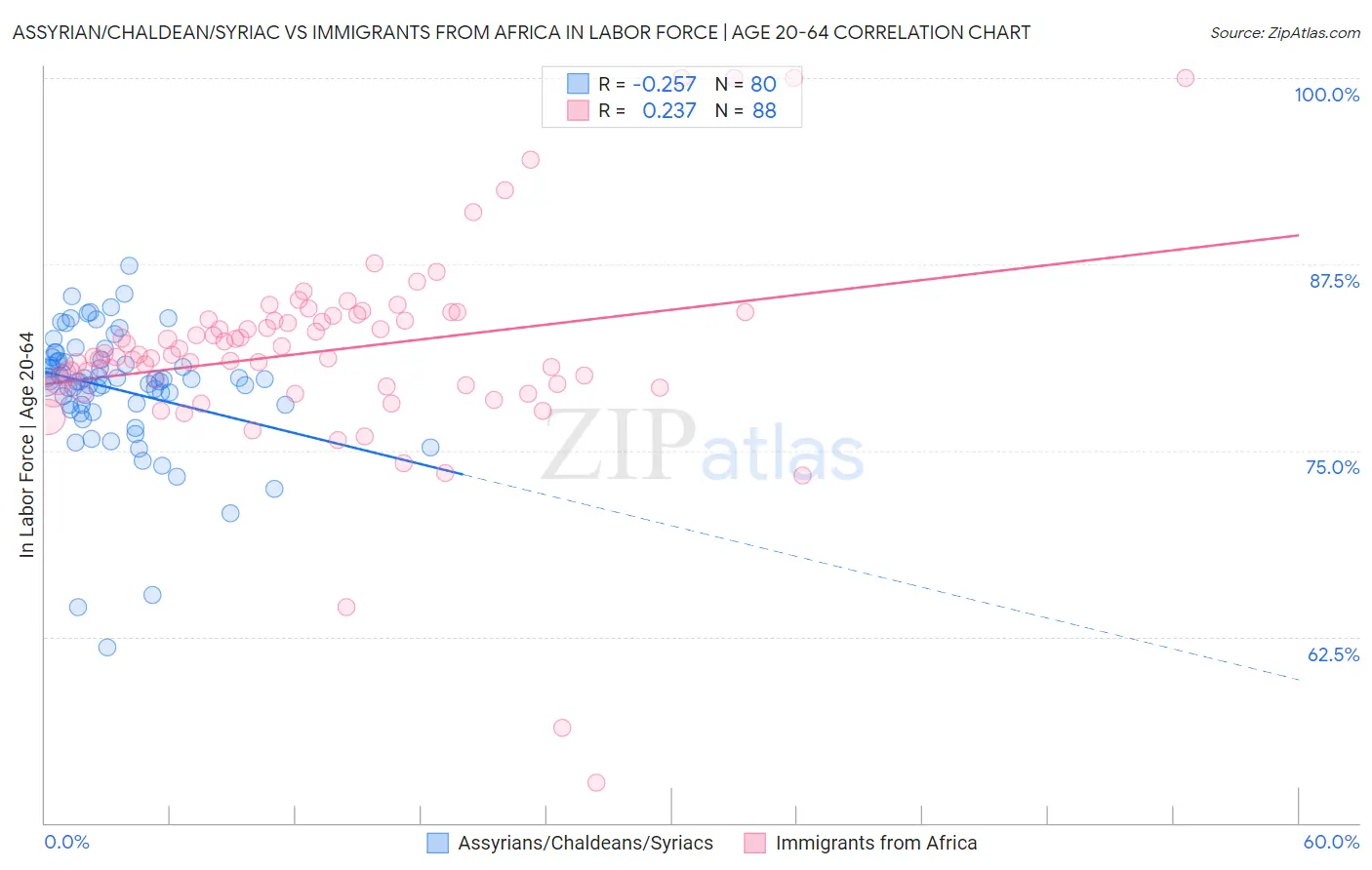 Assyrian/Chaldean/Syriac vs Immigrants from Africa In Labor Force | Age 20-64 Correlation Chart