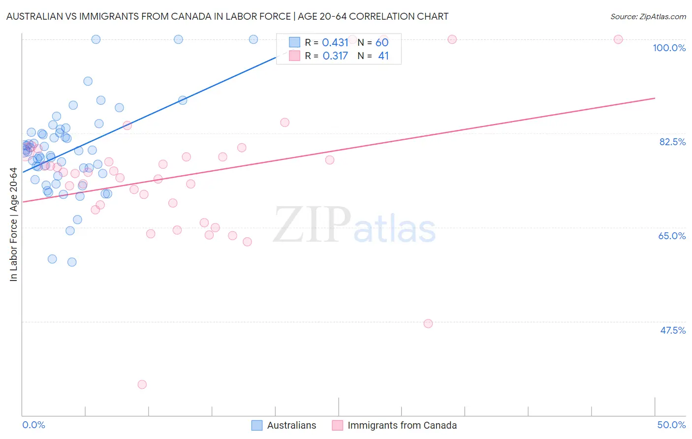 Australian vs Immigrants from Canada In Labor Force | Age 20-64 Correlation Chart