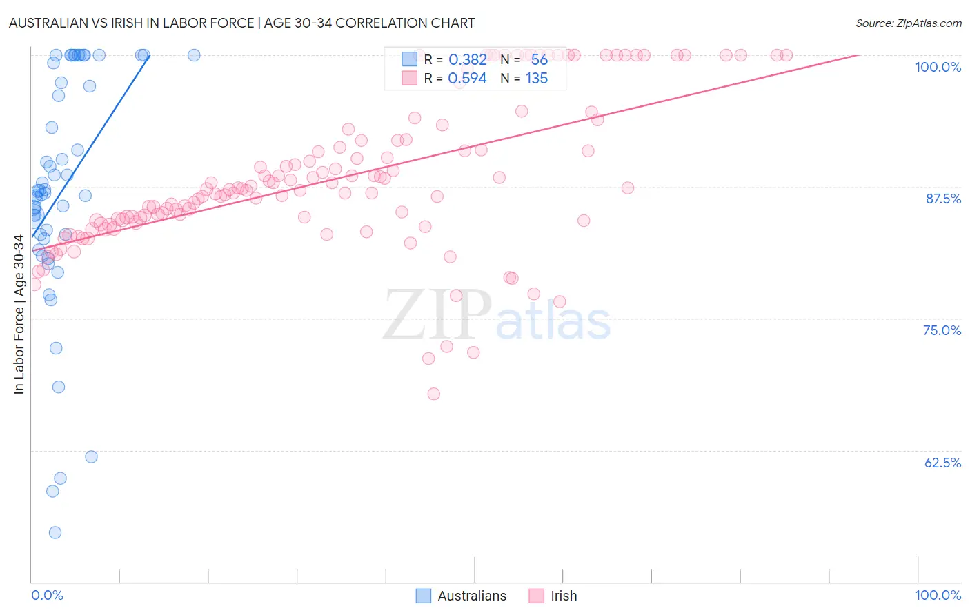 Australian vs Irish In Labor Force | Age 30-34 Correlation Chart