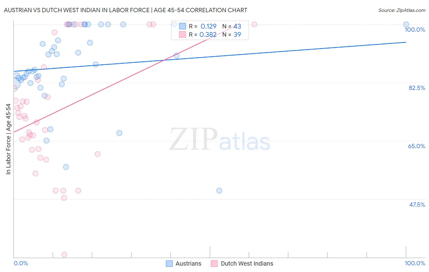 Austrian vs Dutch West Indian In Labor Force | Age 45-54 Correlation Chart