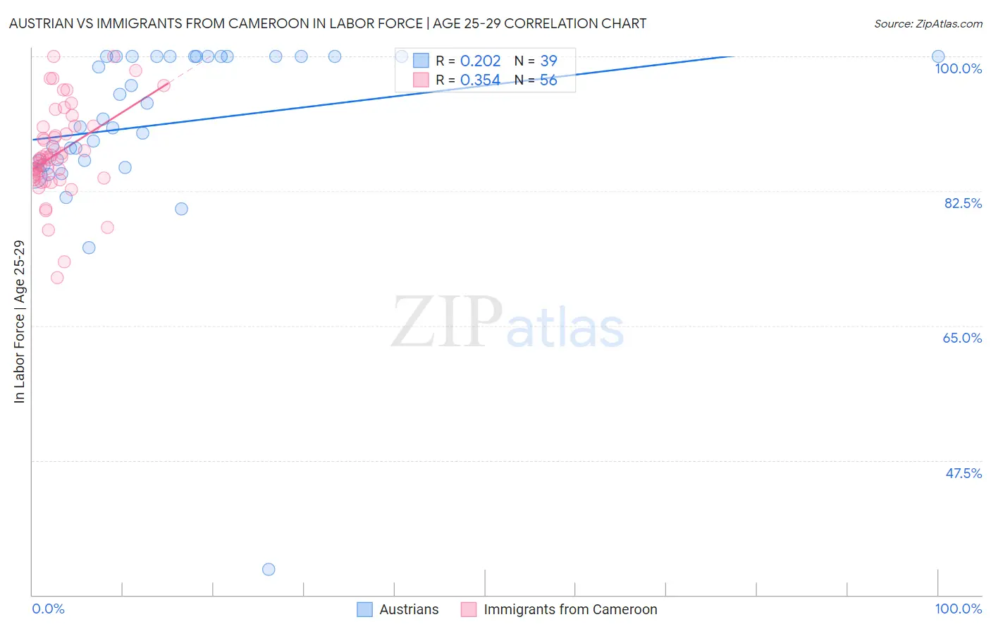 Austrian vs Immigrants from Cameroon In Labor Force | Age 25-29 Correlation Chart