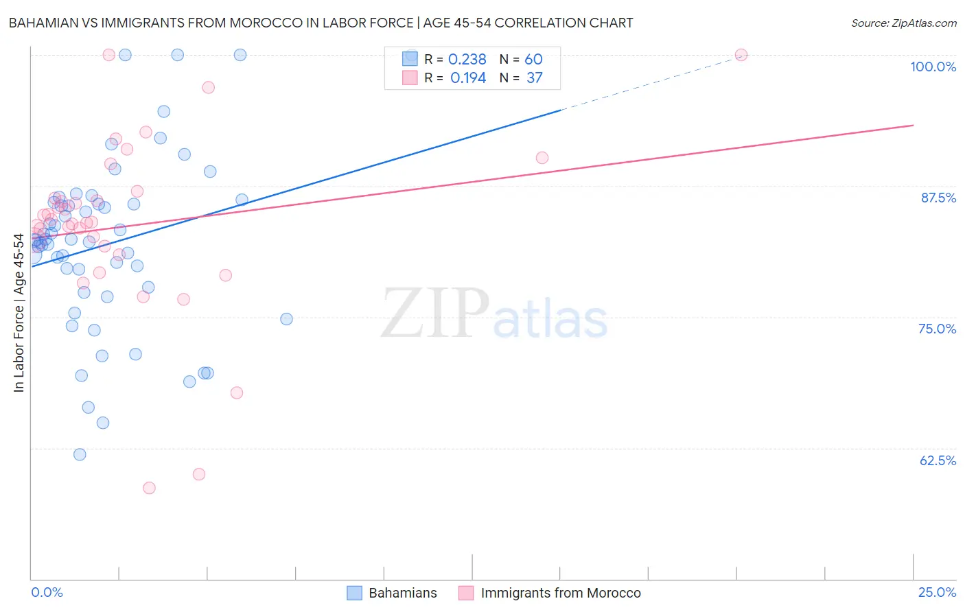 Bahamian vs Immigrants from Morocco In Labor Force | Age 45-54 Correlation Chart
