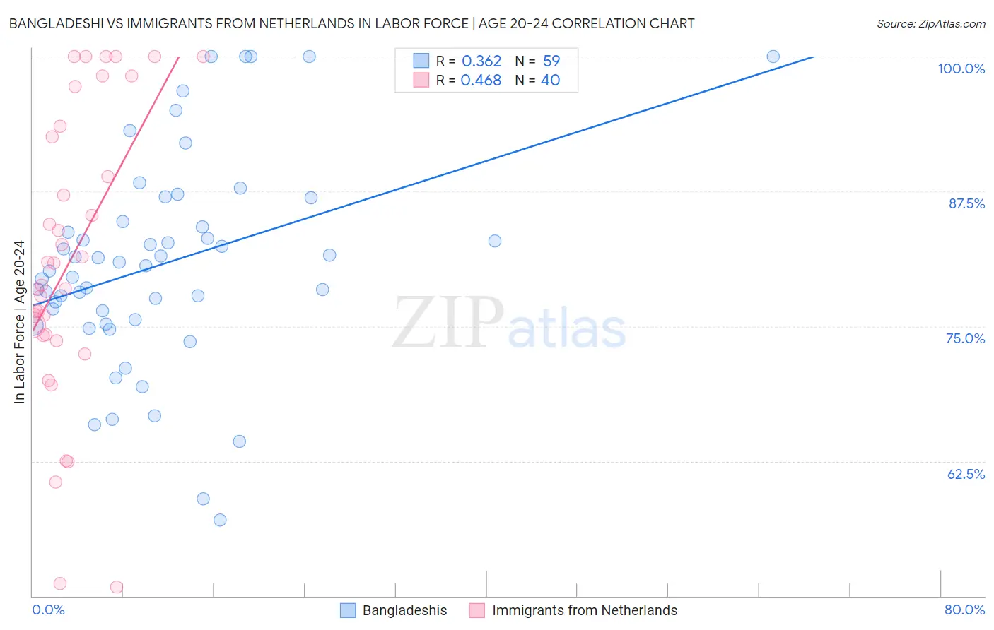 Bangladeshi vs Immigrants from Netherlands In Labor Force | Age 20-24 Correlation Chart