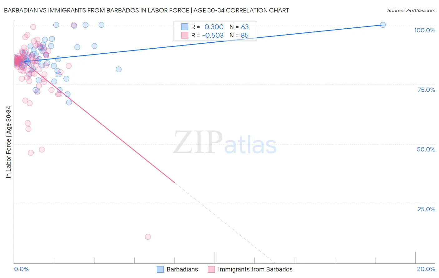 Barbadian vs Immigrants from Barbados In Labor Force | Age 30-34 Correlation Chart