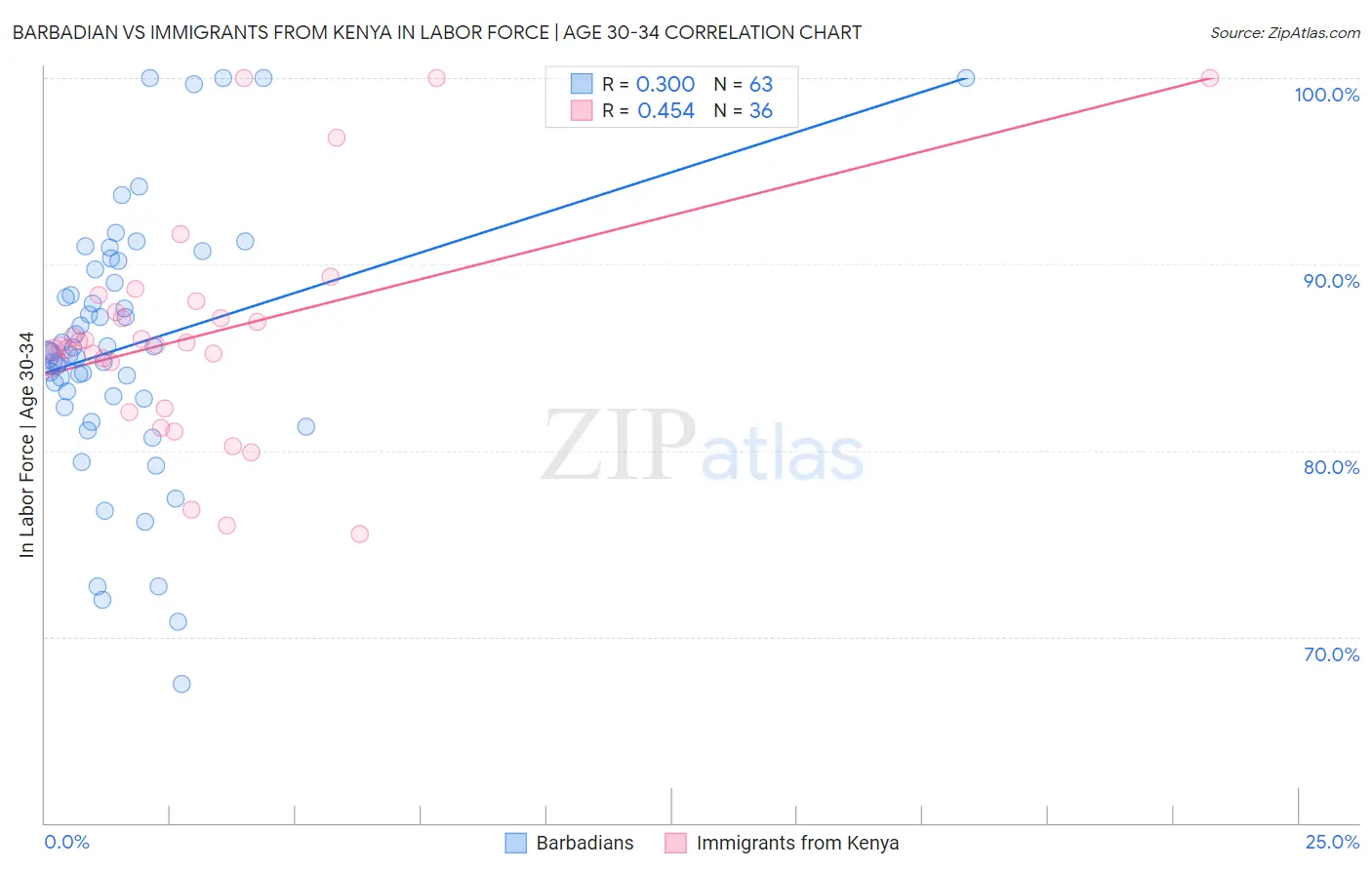 Barbadian vs Immigrants from Kenya In Labor Force | Age 30-34 Correlation Chart