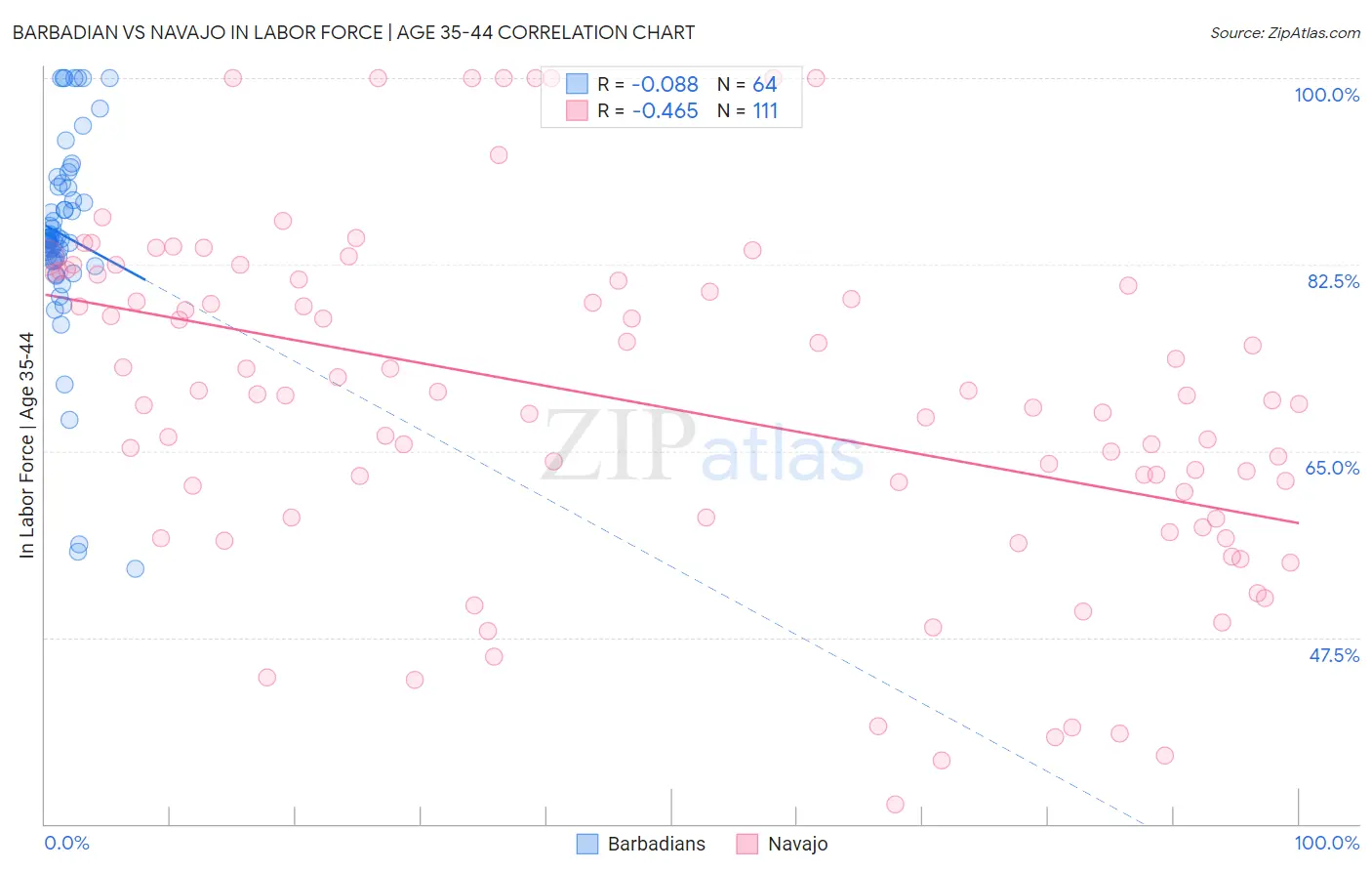 Barbadian vs Navajo In Labor Force | Age 35-44 Correlation Chart