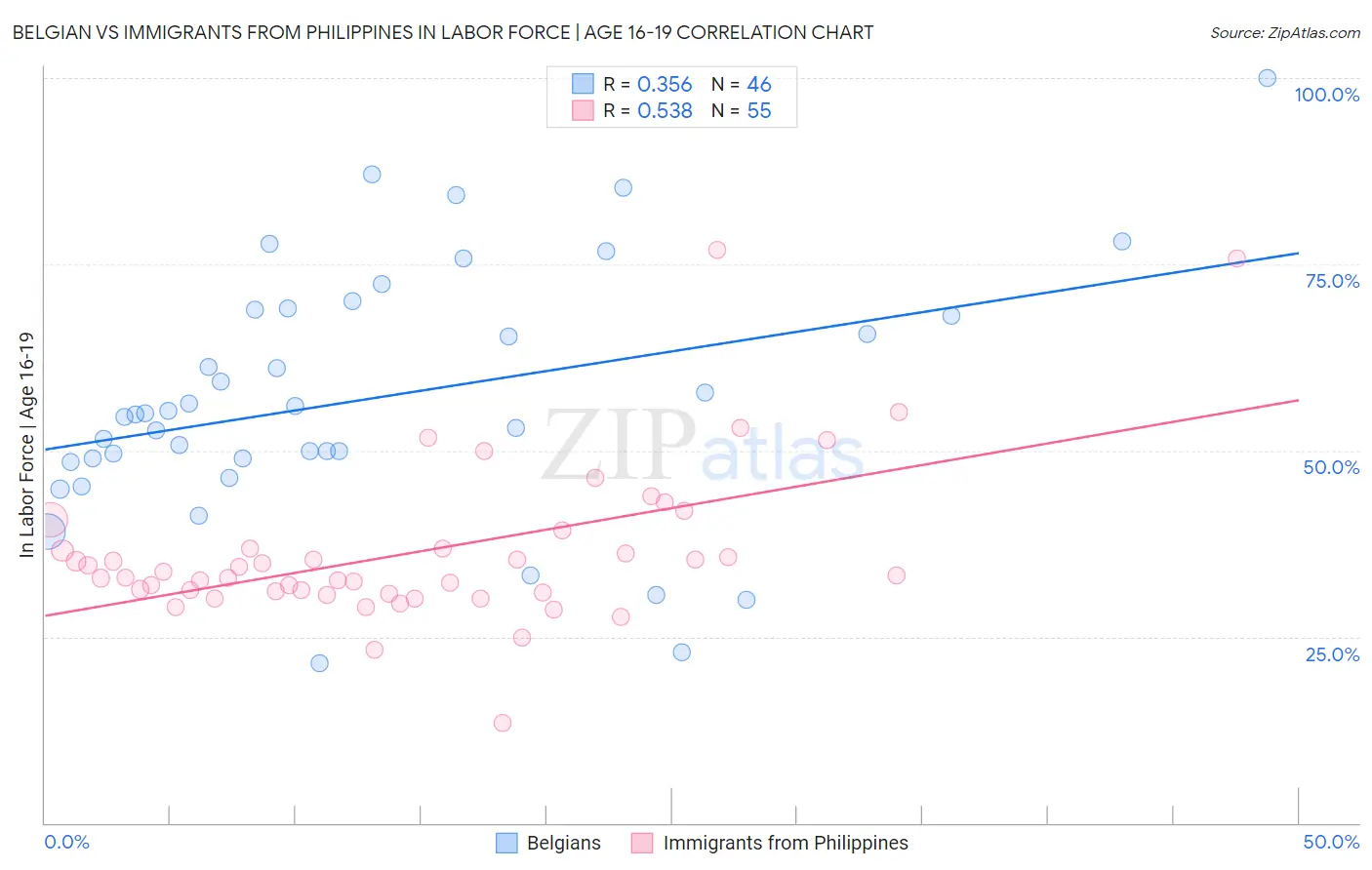 Belgian vs Immigrants from Philippines In Labor Force | Age 16-19 Correlation Chart