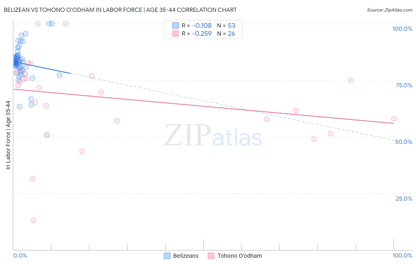Belizean vs Tohono O'odham In Labor Force | Age 35-44 Correlation Chart