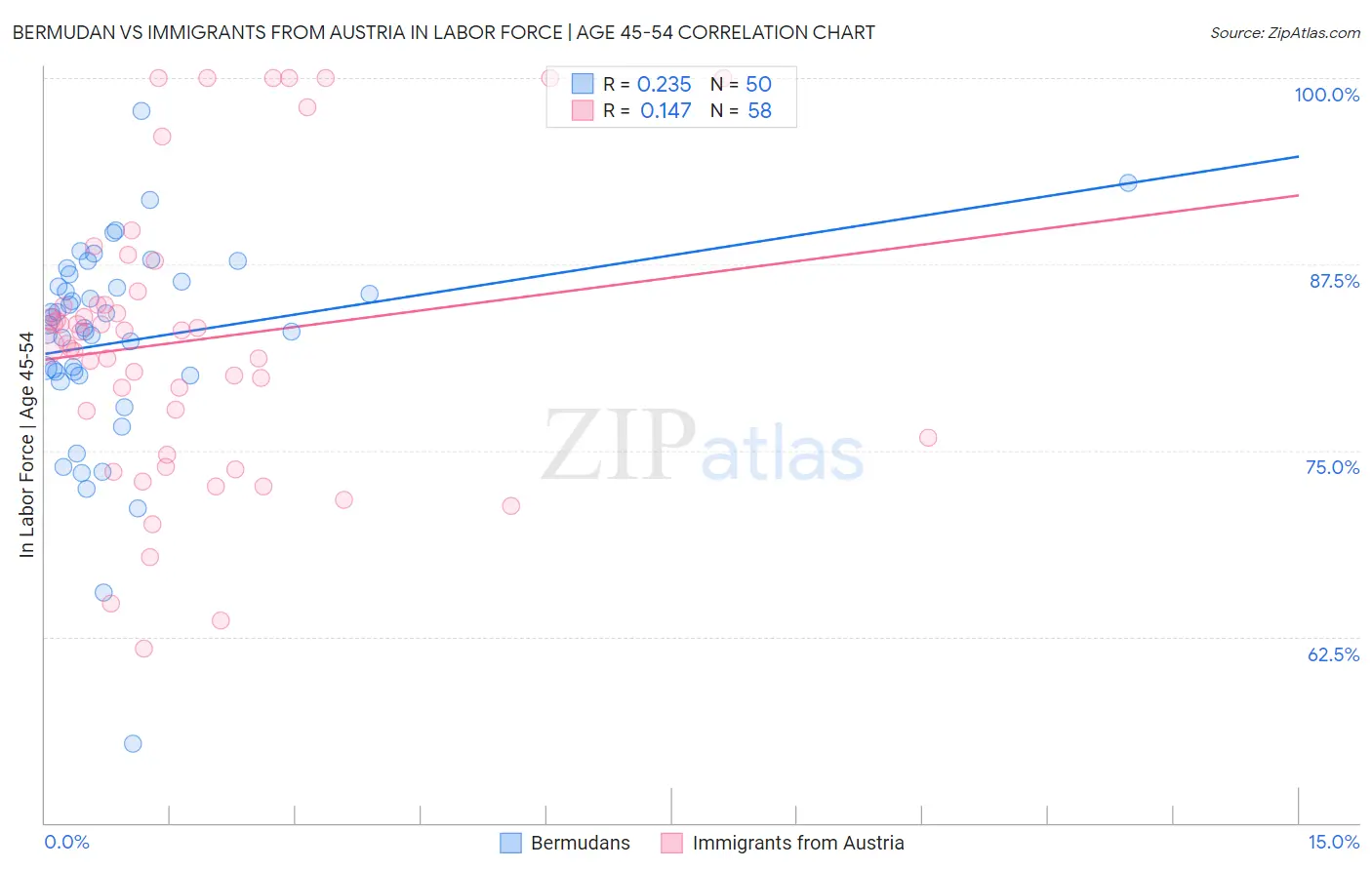 Bermudan vs Immigrants from Austria In Labor Force | Age 45-54 Correlation Chart