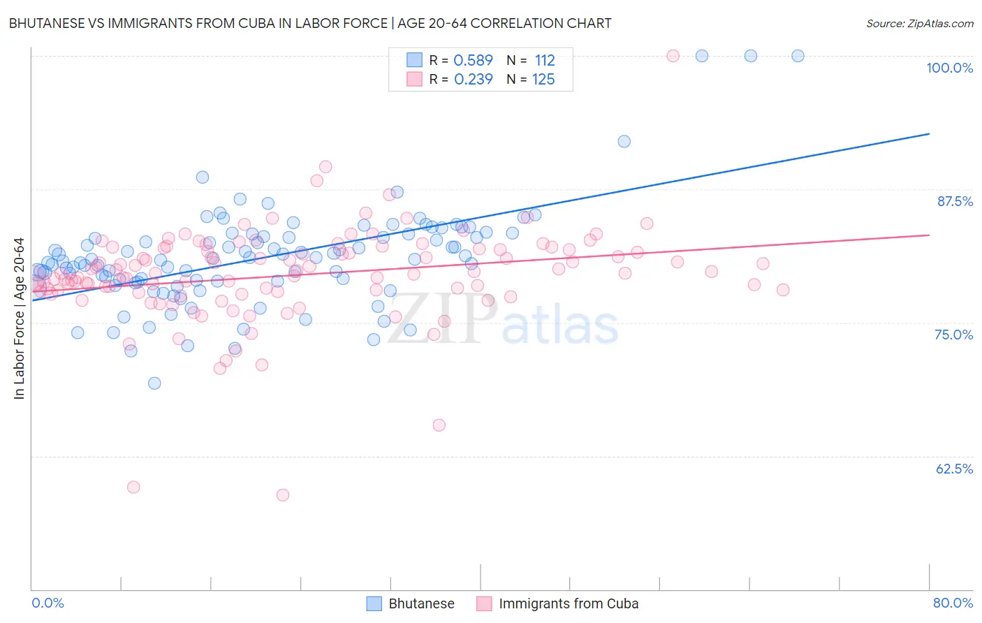 Bhutanese vs Immigrants from Cuba In Labor Force | Age 20-64 Correlation Chart
