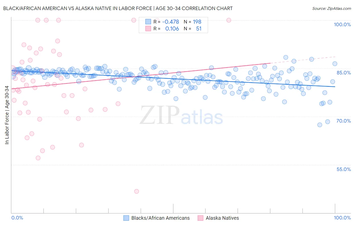 Black/African American vs Alaska Native In Labor Force | Age 30-34 Correlation Chart