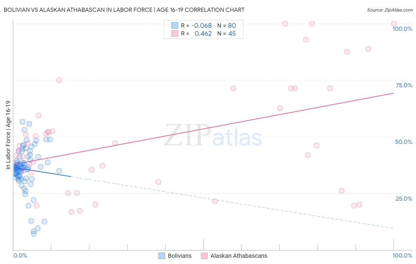 Bolivian vs Alaskan Athabascan In Labor Force | Age 16-19 Correlation Chart