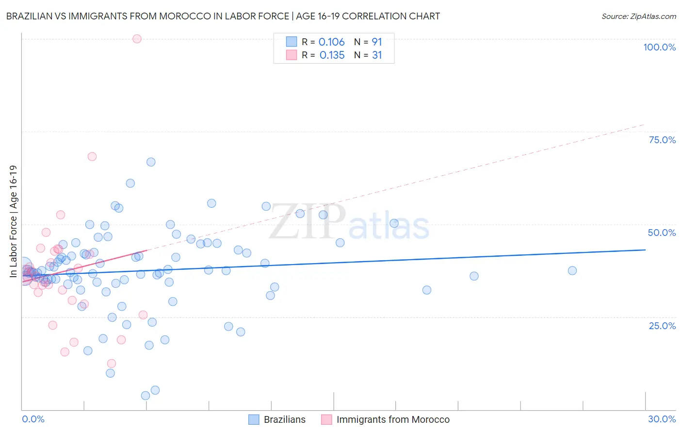Brazilian vs Immigrants from Morocco In Labor Force | Age 16-19 Correlation Chart