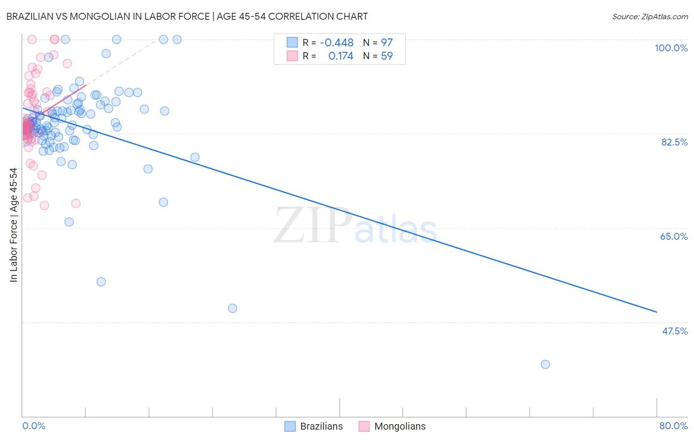 Brazilian vs Mongolian In Labor Force | Age 45-54 Correlation Chart