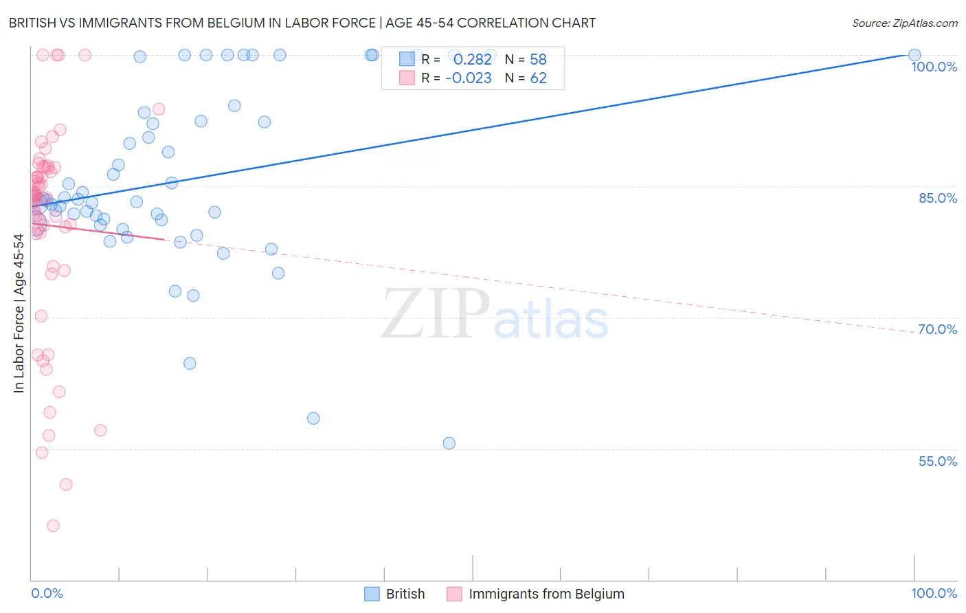 British vs Immigrants from Belgium In Labor Force | Age 45-54 Correlation Chart