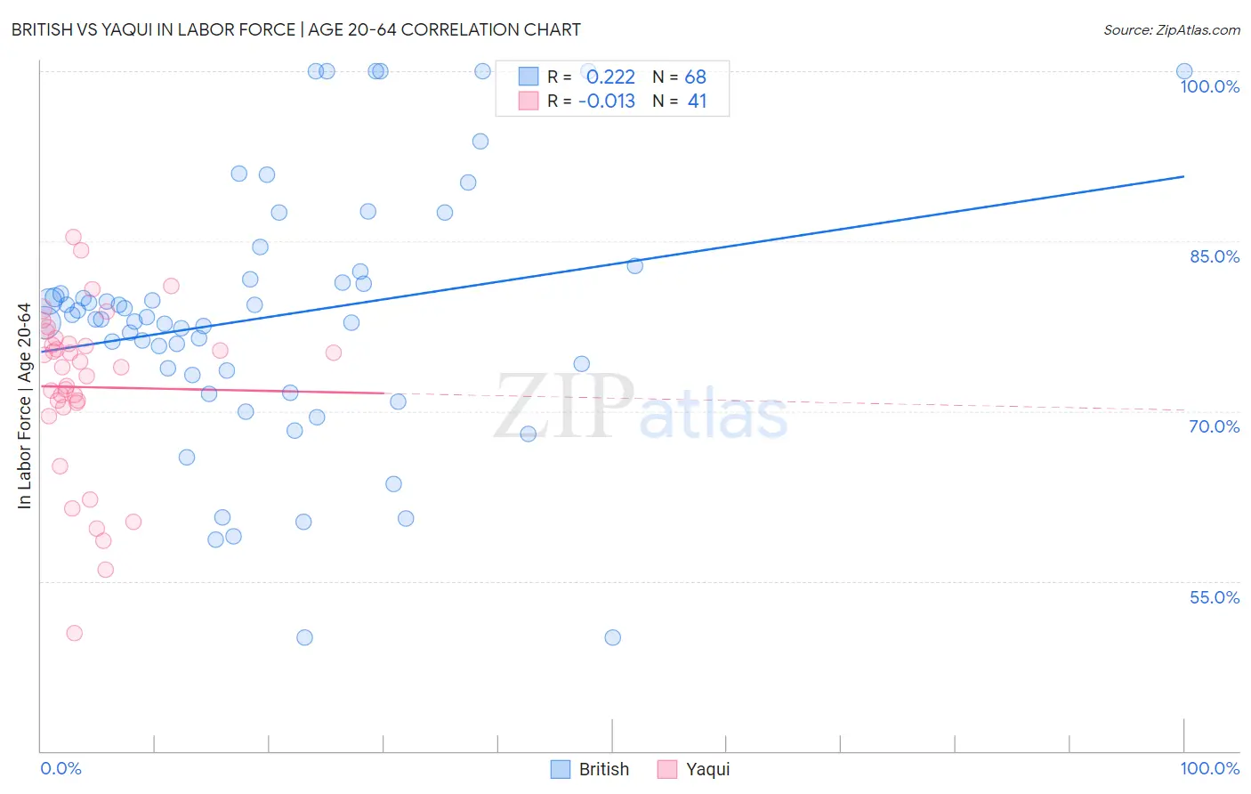 The statistical analysis conducted on geographies consisting of 531,500,819 people shows a weak positive correlation between the proportion of British and labor force participation rate among population between the ages 20 and 64 in the United States with a correlation coefficient (R) of 0.222 and weighted average of 79.3%. Similarly, the statistical analysis conducted on geographies consisting of 107,721,250 people shows no correlation between the proportion of Yaqui and labor force participation rate among population between the ages 20 and 64 in the United States with a correlation coefficient (R) of -0.013 and weighted average of 76.5%, a difference of 3.6%.