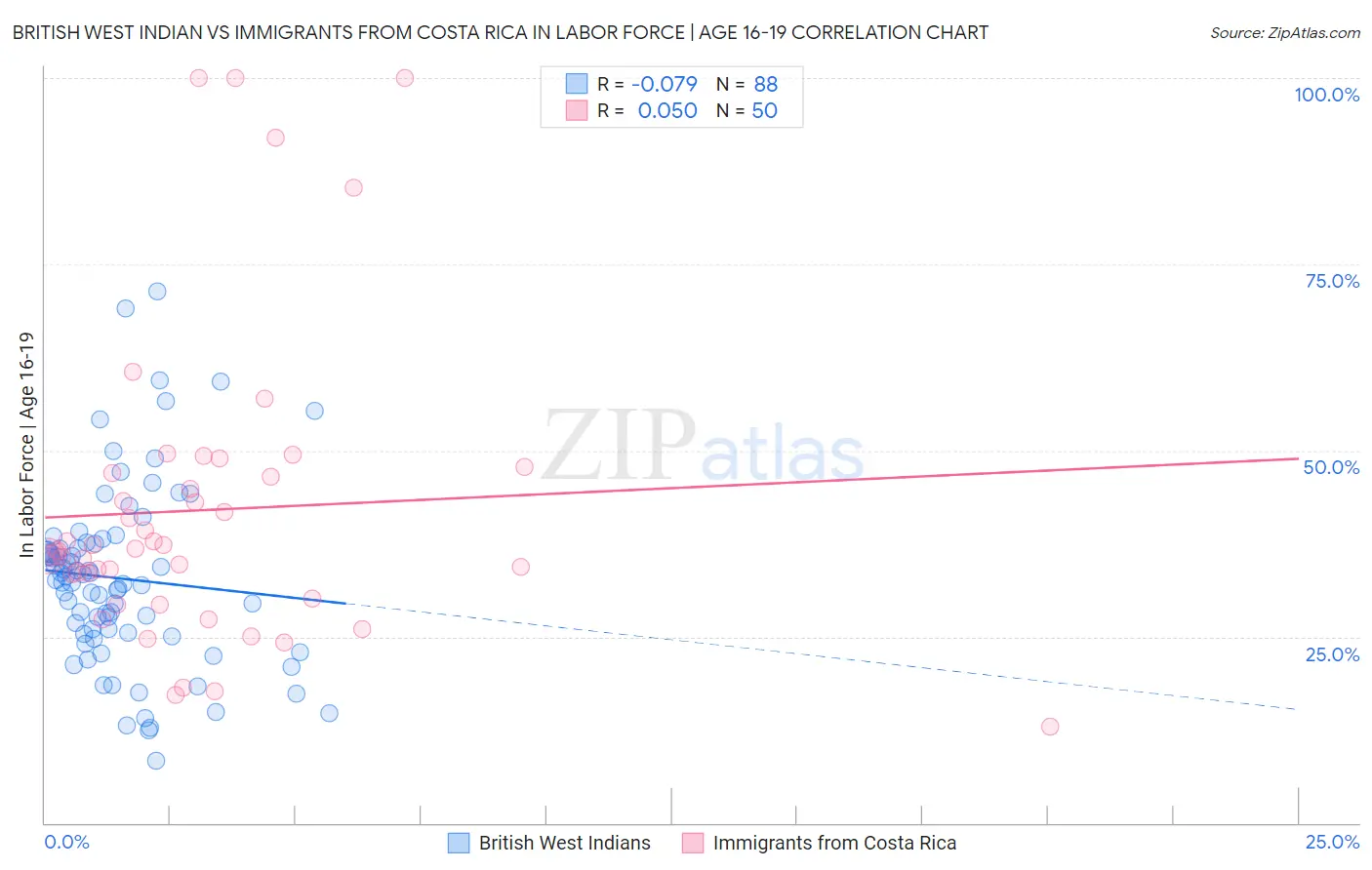 British West Indian vs Immigrants from Costa Rica In Labor Force | Age 16-19 Correlation Chart
