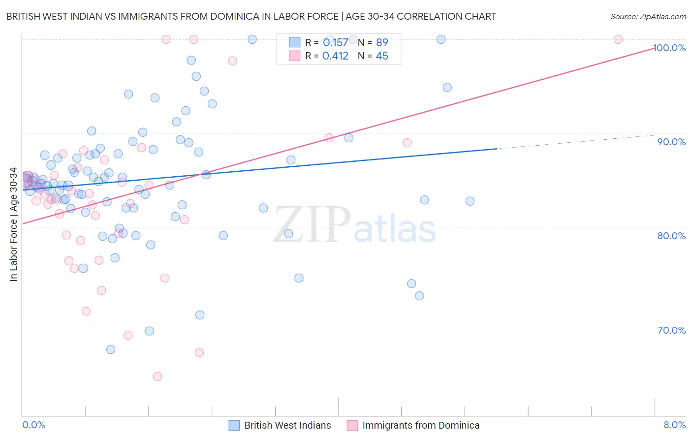 British West Indian vs Immigrants from Dominica In Labor Force | Age 30-34 Correlation Chart