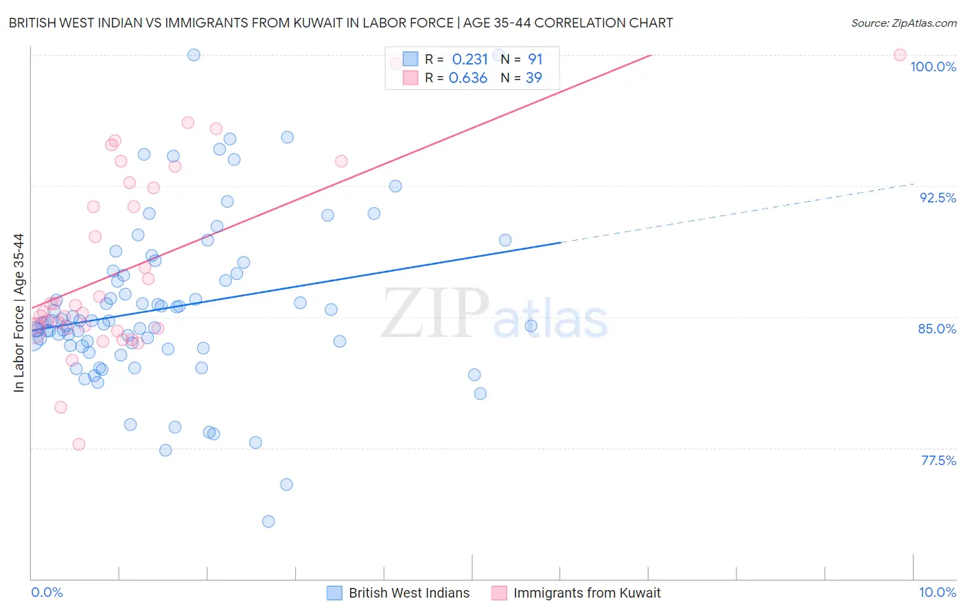 British West Indian vs Immigrants from Kuwait In Labor Force | Age 35-44 Correlation Chart