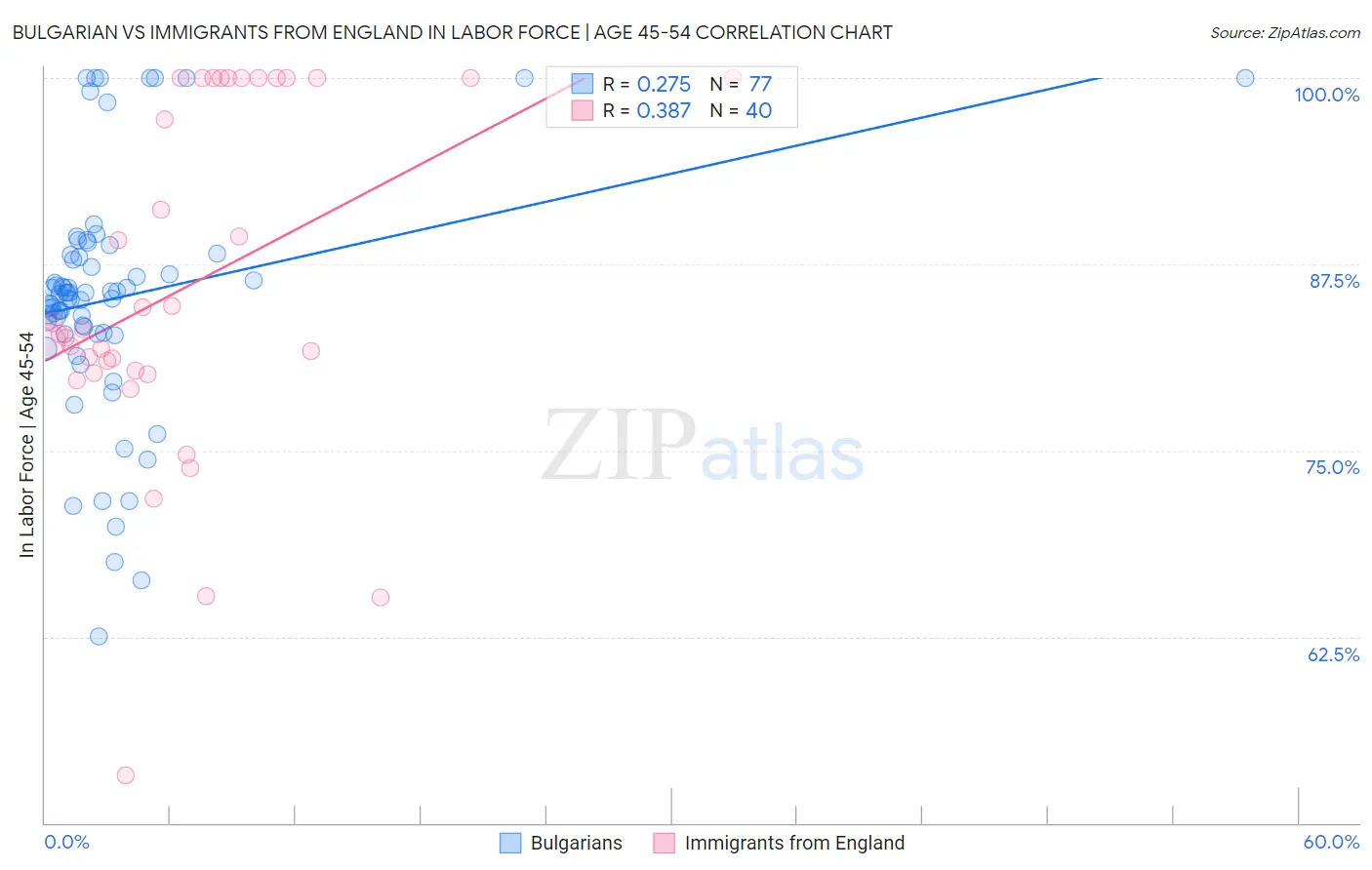 Bulgarian vs Immigrants from England In Labor Force | Age 45-54 Correlation Chart