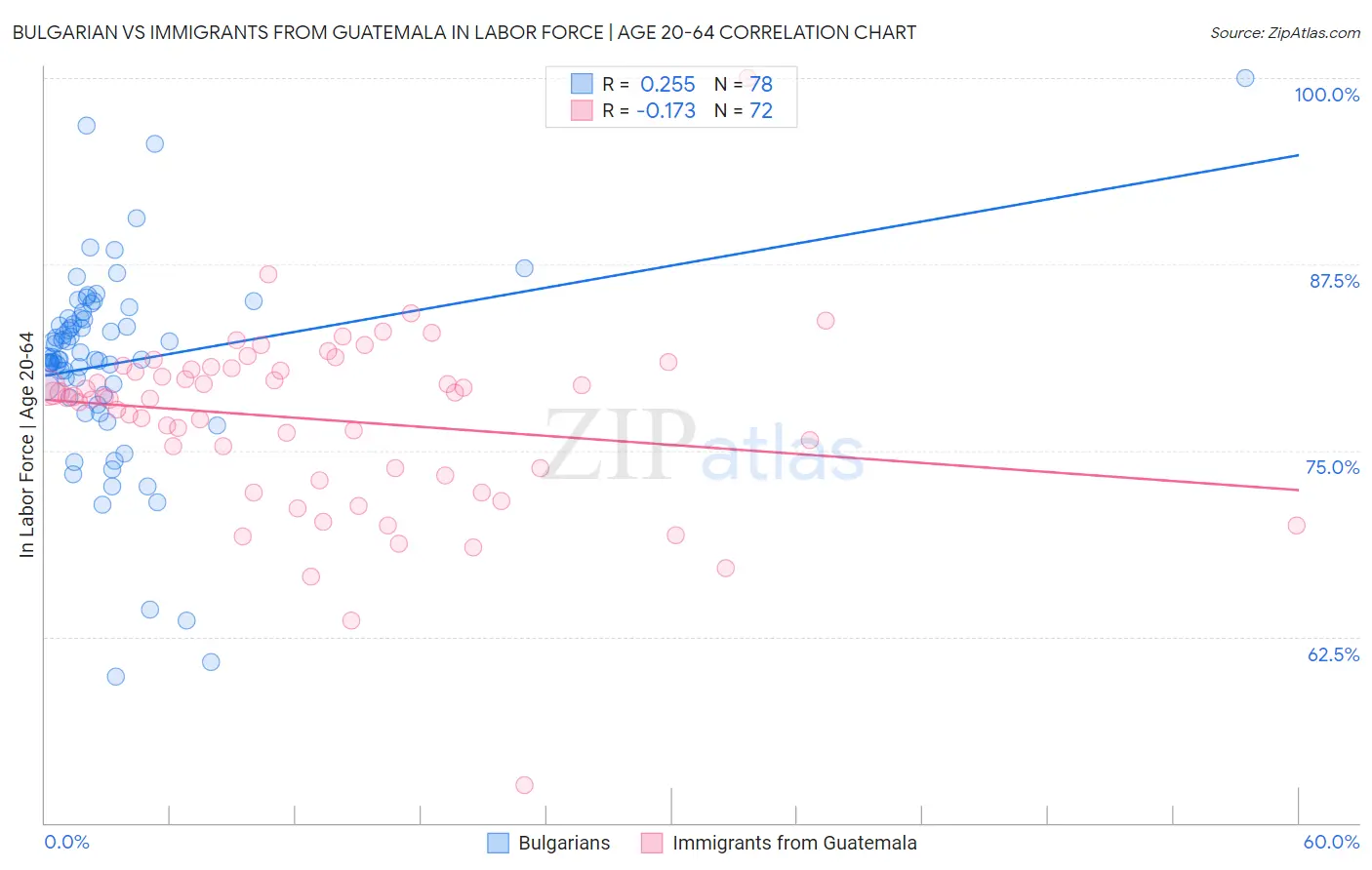 Bulgarian vs Immigrants from Guatemala In Labor Force | Age 20-64 Correlation Chart