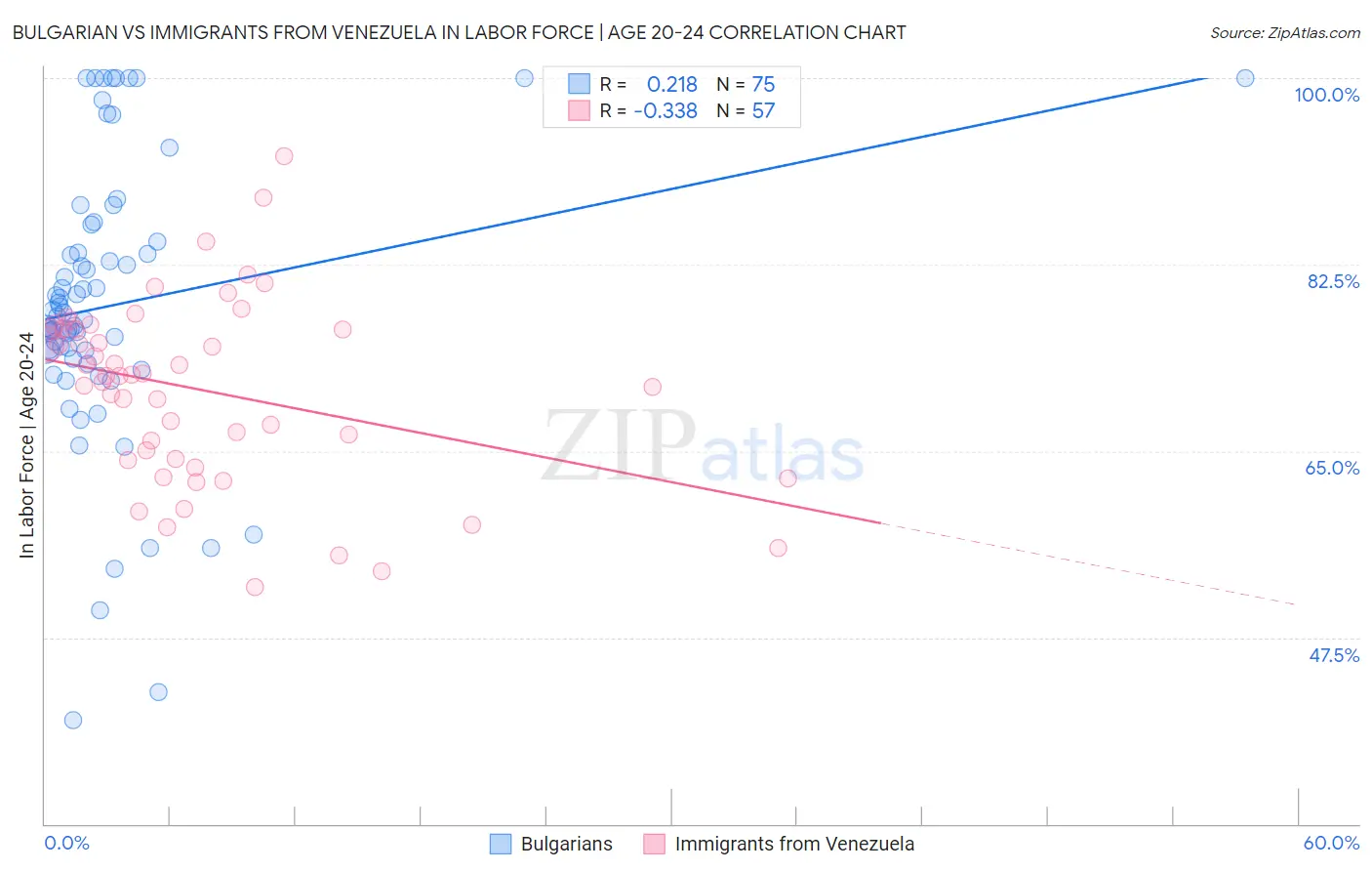 Bulgarian vs Immigrants from Venezuela In Labor Force | Age 20-24 Correlation Chart