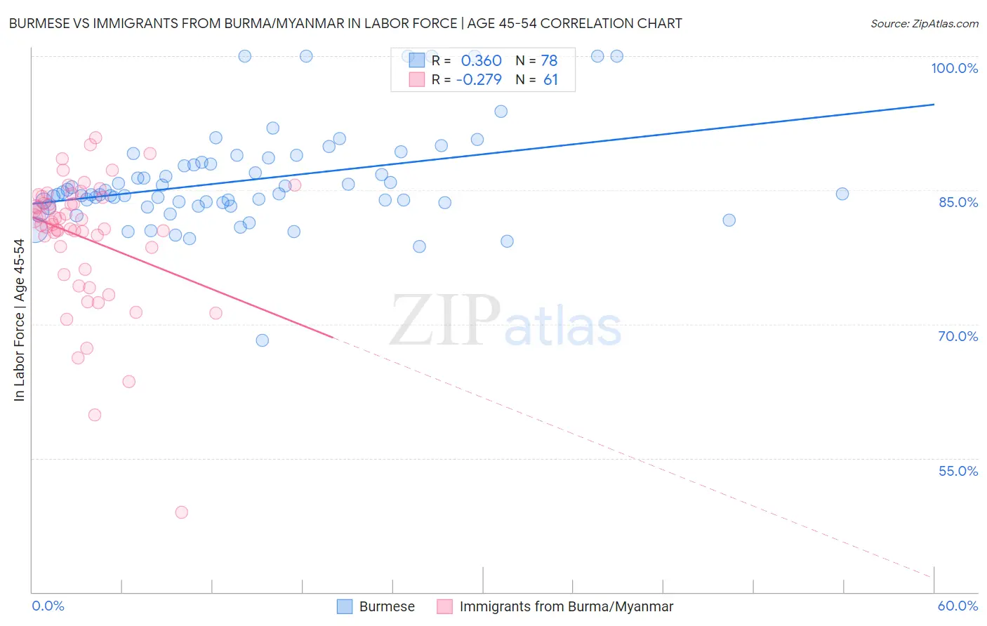 Burmese vs Immigrants from Burma/Myanmar In Labor Force | Age 45-54 Correlation Chart